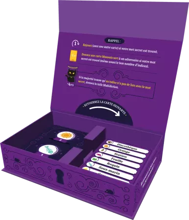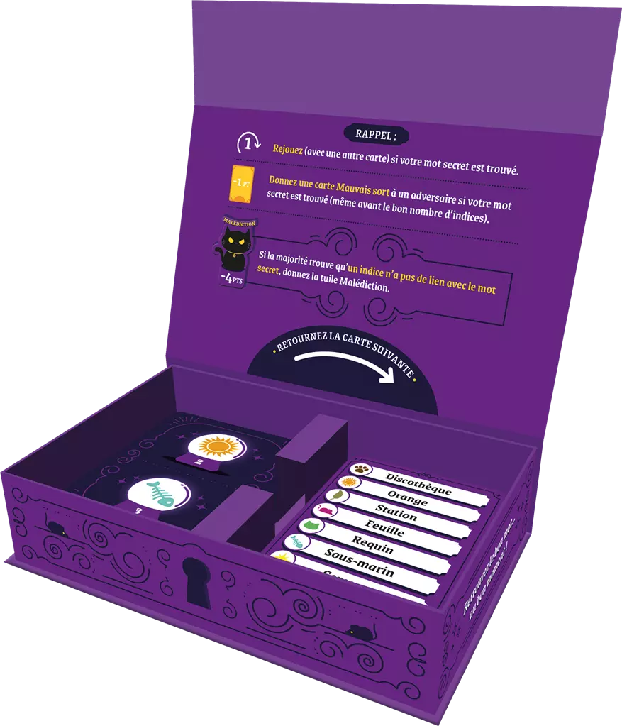 1- Un joueur ouvre discrètement la boite et découvre un mot à faire deviner avec un nombre précis d’indices.