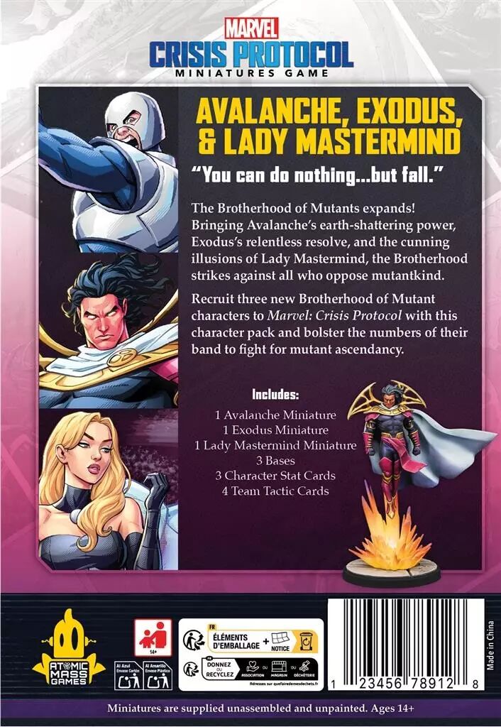 La Confrérie des Mutants s’agrandit ! Elle se renforce avec la puissance d’Avalanche, la détermination implacable d’Exodus et les illusions subtiles de Lady Mastermind, afin de combattre tous ceux qui s’opposent aux mutants. Ce Set de Personnages vous permettra d’ajouter trois nouvelles figurines de la Confrérie des Mutants à vos parties de Marvel : Crisis Protocol afin de renforcer vos escouades qui cherchent à affirmer la supériorité des mutants !Figurines à monter et non peintes.