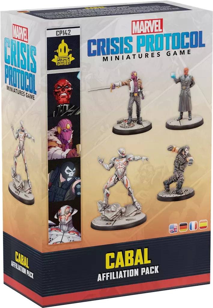 Lorsqu’ils ont accès à un pouvoir inimaginable, certains l’utilisent pour défendre leur foyer, d’autres pour commettre des délits mineurs, mais les derniers ne visent que la récompense suprême : la conquête du monde. Cette troisième catégorie d’individus forme la sinistre Cabale, une faction hétéroclite de conquérants potentiels. Leur quête est sans fin, leurs troupes inlassables et leurs méthodes brutales. Composez votre propre Cabale pour vos parties de Marvel : Crisis Protocol grâce à cette extension. Dans cette boîte, vous trouverez les figurines finement détaillées (à assembler et non peintes) de Crâne Rouge, Baron Zemo, Crossbones et Ultron, ainsi que leurs cartes Statistiques et des cartes Tactique d’Équipe. Rassemblez votre escouade et mettez en œuvre leurs sinistres stratagèmes.