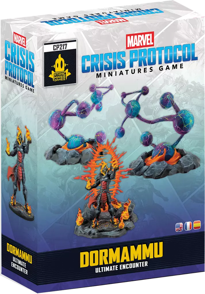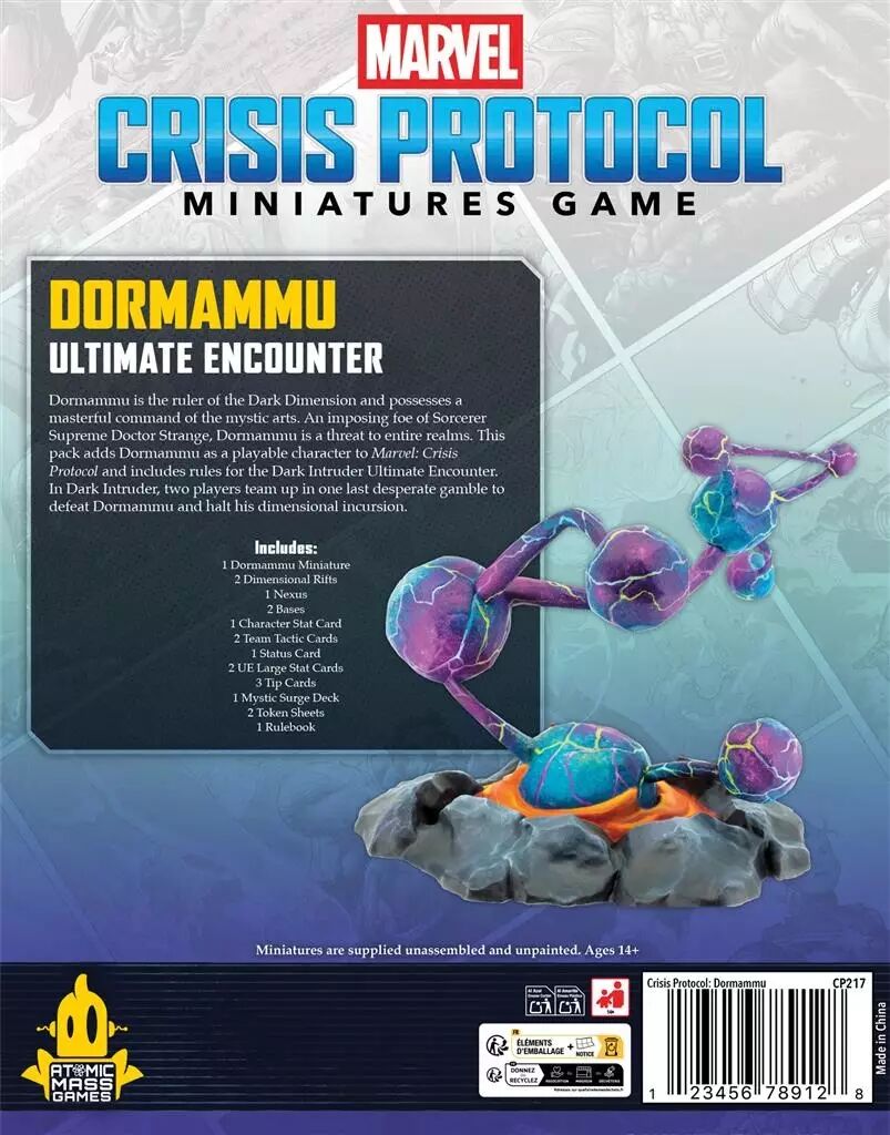 Cette extension pour Marvel : Crisis Protocol™ contient un nouveau personnage : Dormammu, ennemi juré du Docteur Strange. Ce souverain de la Dimension Noire, qui possède une maîtrise magistrale des arts mystiques, est une redoutable menace pour de nombreux royaumes. Découvrez également un scénario coopératif, Ultime Rencontre, dans lequel deux joueurs devront vaincre Dormammu dans une tentative désespérée pour stopper son incursion dimensionnelle. Les joueurs constituent une Équipe de Crise composée de plusieurs escouades pour combattre la menace lors de missions narratives appelées Rencontres. Chacune de ces Rencontres précise le nombre de cartes tactique d'équipe ainsi que la taille d'escouade pour chaque joueur. La boîte contient la figurine de Dormammu et 3 éléments de décor (Nexus et deux figurines de Failles Dimensionnelles). Figurines à monter et non peintes.