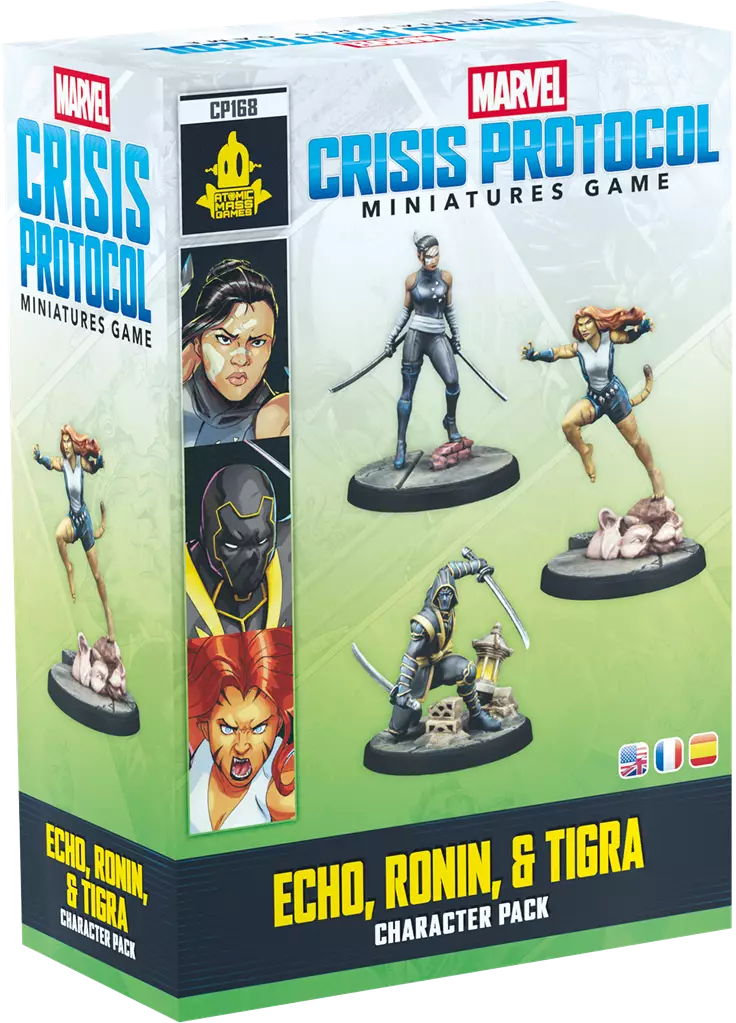 Ce pack de personnages ajoute trois nouveaux personnages à Marvel : Crisis Protocol. Echo excelle aux tactiques de délit de fuite, étant capable de lancer des attaques surprises et de s'enfuir. Ronin a de puissantes compétences martiales qui font de lui un excellent combattant au contact. Tigra utilise ses réflexes félins mystiques et sa force pour vaincre ses ennemis. Figurines à monter et non peintes.