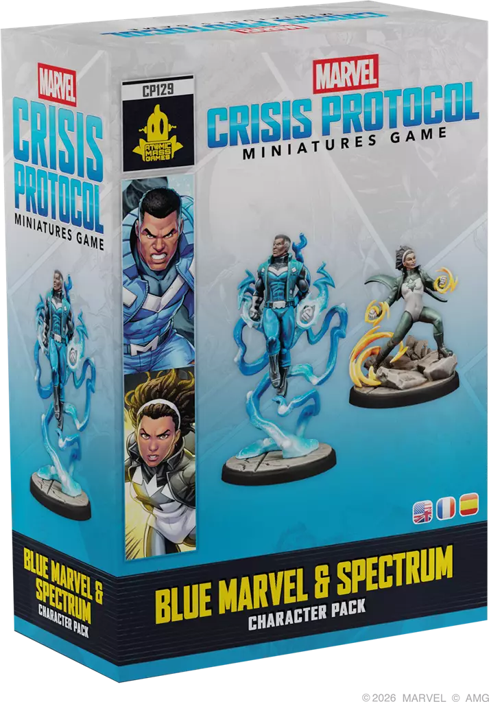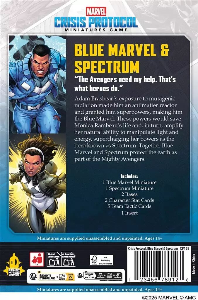 Ce pack apporte donc deux nouveaux personnages à Marvel : Crisis Protocol™. Spectrum dispose du pouvoir "Plus forts ensemble que Seuls" utilisable sur les personnages affiliés aux Mighty Avengers. Il permet de transférer une partie du pouvoir gagné à ses alliés. Blue Marvel sert de son côté de puissant tank tout en causant de gros dégâts à longue et courte portée. Figurines à monter et non peintes.
