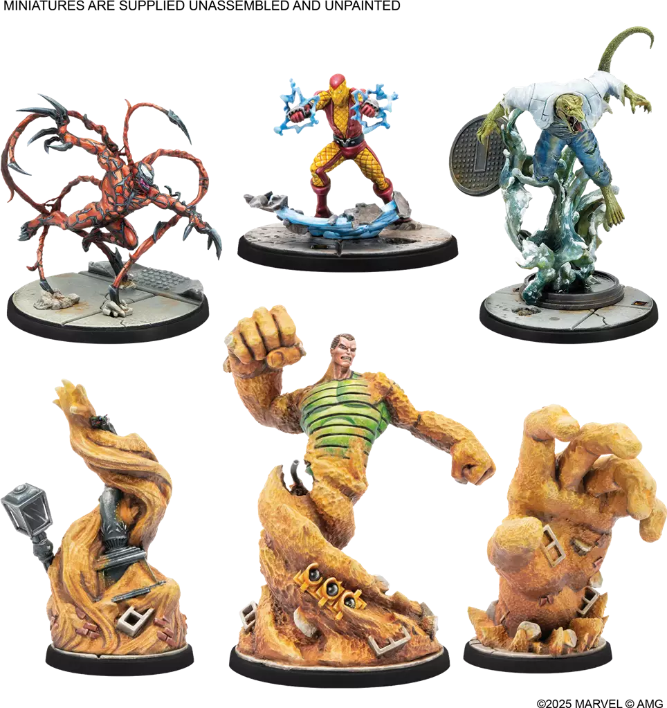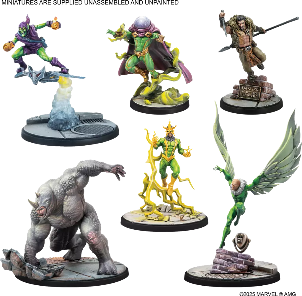 10 figurines de héros/villains complètement équipées : Green Goblin, Kraven, Lizard, Mysterio, Shocker, Sandman, Carnage, Rhino, Vulture, Electro.