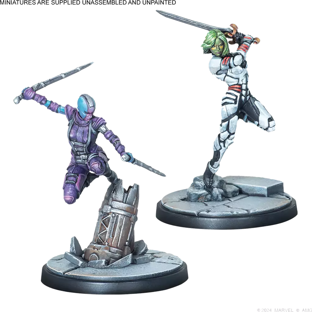 Gamora : Adoptée par Thanos, elle a été élevée pour devenir la combattante la plus redoutable de la galaxie. Sa maîtrise du combat et sa détermination à se libérer du passé sombre de son père adoptif font d'elle une alliée incontournable. Gamora a aussi un lien complexe avec Nebula, sa sœur adoptive, avec qui elle partage une relation tumultueuse.