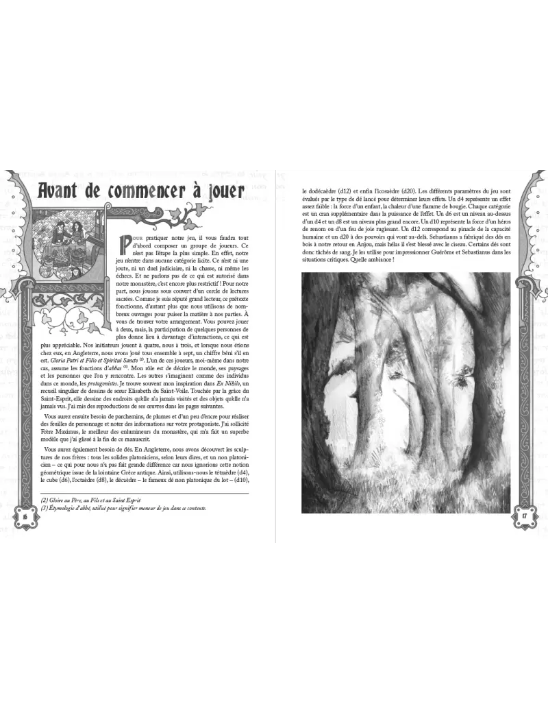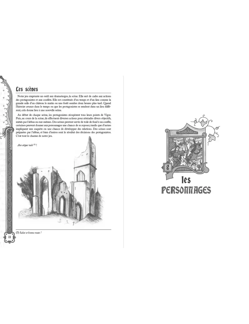 Le livre de base se compose des règles traduites d’un jeu anglais, mais réécrites à la façon d’un moine du XIIème. Un décor de campagne, situé en Écosse, sur les bords du Loch Ness, et un scénario permettent de se lancer dans l’aventure.