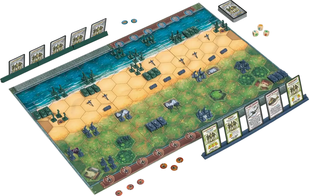 Chaque joueur dispose de troupes, sous la forme de nombreuses figurines et de cartes. Ces cartes indiquent clairement quelles troupes activer : il suffit de choisir judicieusement laquelle jouer et de lancer les dés pour revivre ces moments clefs de la Seconde Guerre Mondiale.