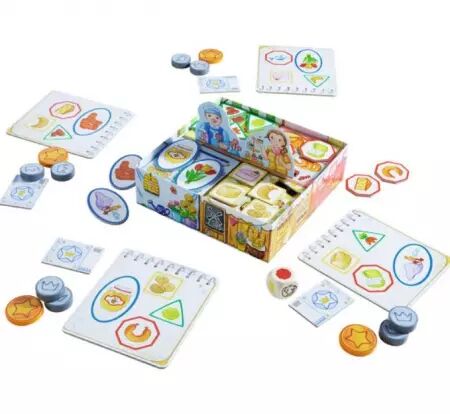 Contenu: 1 étal, 12 pièces en bois, 4 billets HABA, 16 plaquettes de produits, 4 listes de courses, 1 dé, 1 règle du jeu.