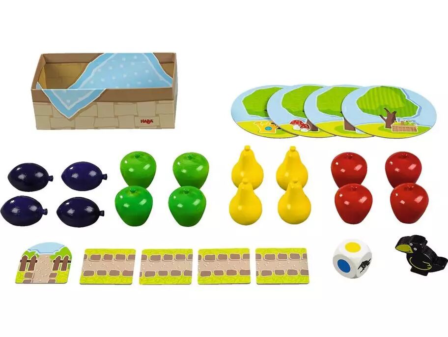 Contenu: 1 corbeau et 16 fruits en bois, 1 panier pour fruits, 5 cartes de chemin, 4 arbres, 1 dé, 1 règle du jeu.
