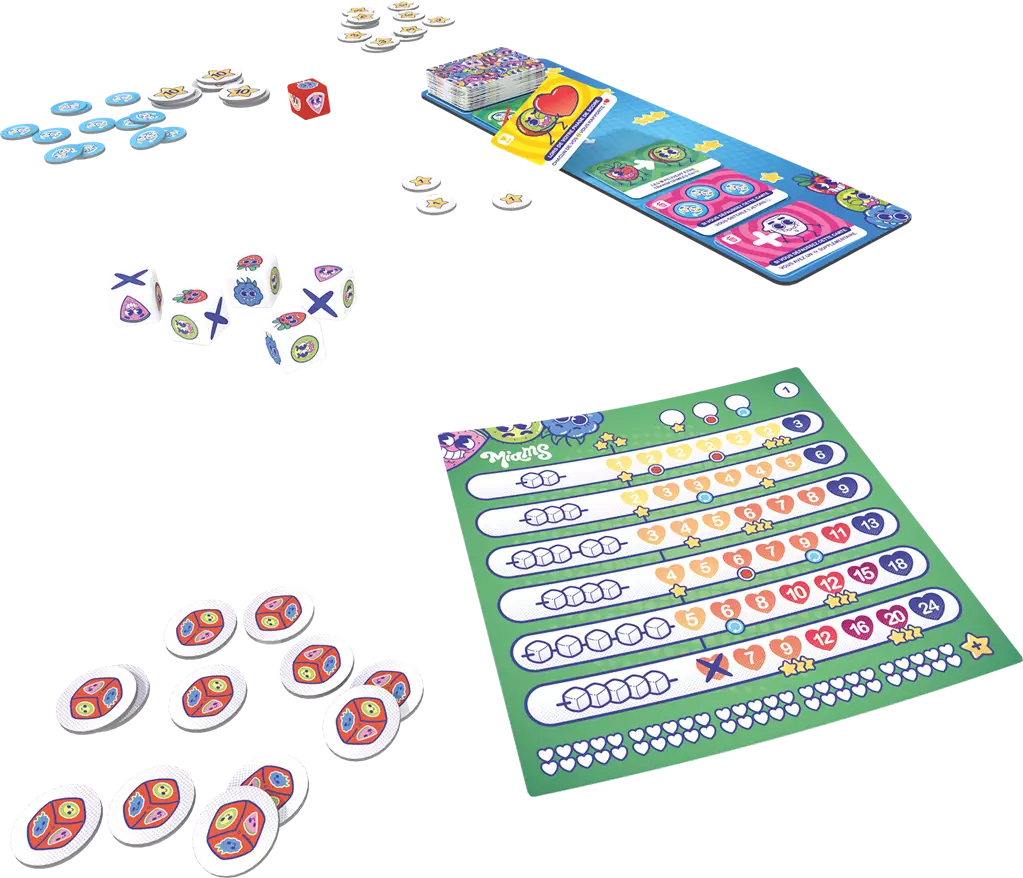 Dans Miams, vous lancez cinq dés à chaque tour pour créer des combinaisons fruitées (paire, brelan, full, ou encore suite). Chaque combinaison vous permet de cocher des cœurs sur votre feuille et d’empocher des bonus qui alimentent votre stratégie et accélèrent votre progression.