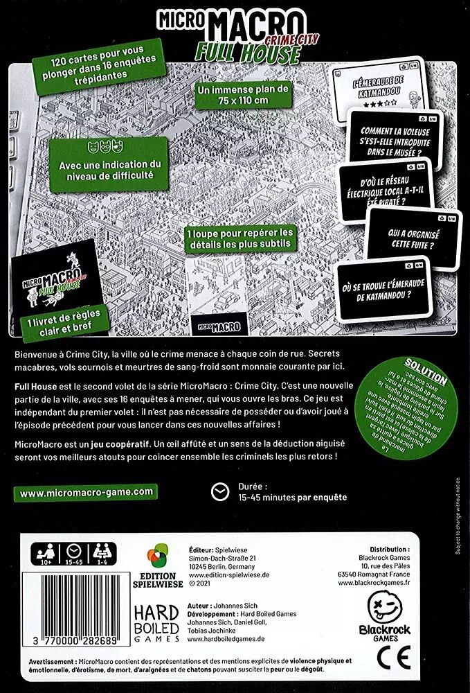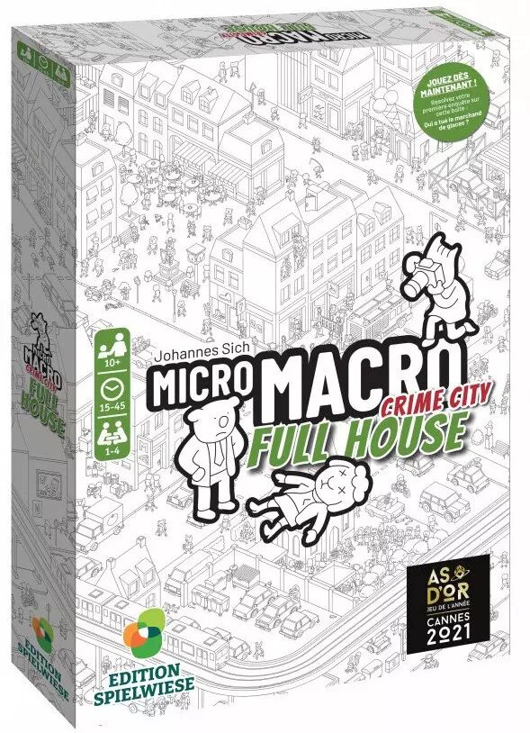 Full House est le second volet de la série MicroMacro : Crime City. C'est une nouvelle partie de la ville, avec ses 16 enquêtes à mener, qui vous ouvre les bras. Ce jeu est indépendant du premier volet : il n'est pas nécessaire de posséder ou d'avoir joué à l'épisode précédent pour vous lancer dans ces nouvelles affaires ! MicroMacro est un jeu coopératif. Un oeil affûté et un sens de la déduction aiguisé seront vos meilleurs atouts pour coincer ensemble les criminels les plus retors !