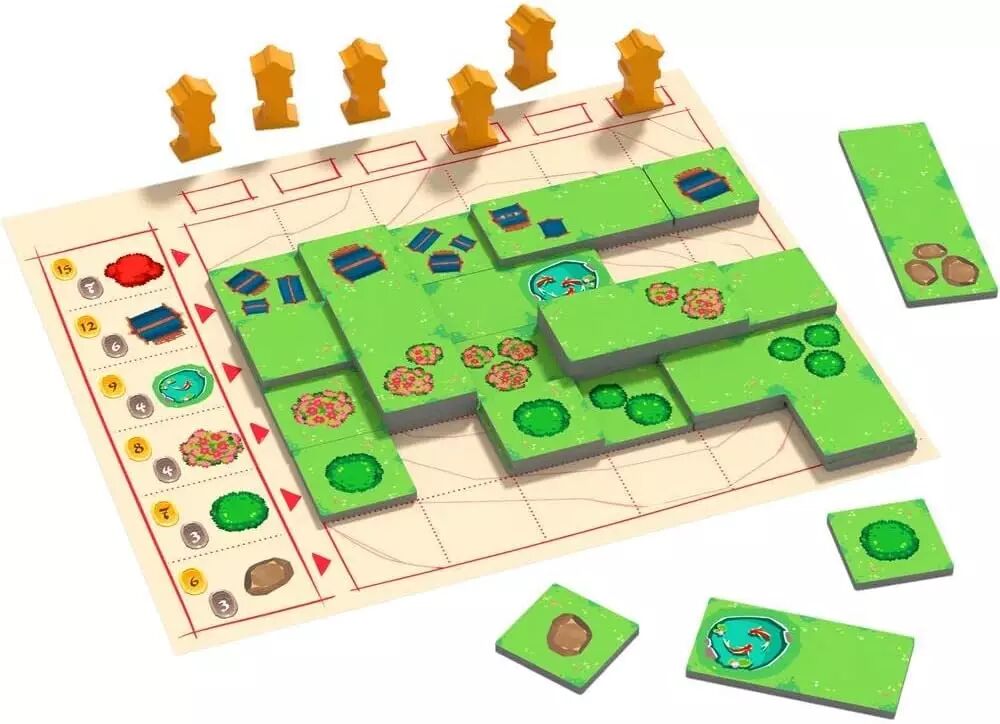 Dans ce jeu d’assemblage captivant, tout est question de tactique et d’agencement. Celui qui parviendra à placer sur plusieurs niveaux des rochers, buissons et arbres avec talent, et à installer des étangs et pagodes en harmonie avec la valeur esthétique « miyabi », sera le maître jardinier de la saison.