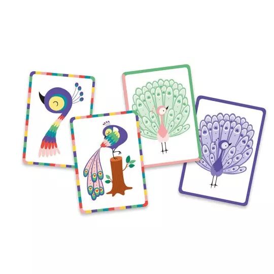 Pose ta carte paon s’il a la même couleur de tête ou de roue que le paon face visible et sois le premier à ne plus avoir de cartes !
