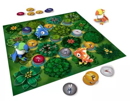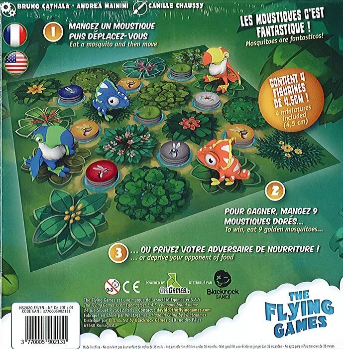 Réf. : FLY015MO Dans la jungle, terrible jungle, Toucans et Caméléons sont en quête de nourriture. Tous convoitent les Moustiques que l'on trouve autour des mares.Les dorés sont particulièrement recherchés pour leur goût intense. Pour l'emporter, soyez le premier à manger 9 Moustiques dorés ou à bloquer votre adversaire...