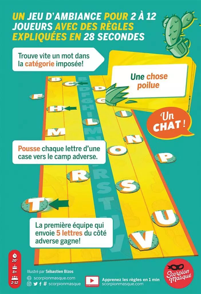 Deux équipes s'affrontent. À votre tour, trouvez vite un mot correspondant à la catégorie imposée puis déplacez chacune de ses lettres vers vous. La première équipe à capturer 6 lettres en les extirpant du plateau l'emporte !
