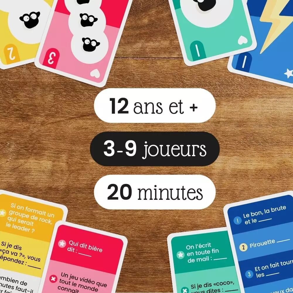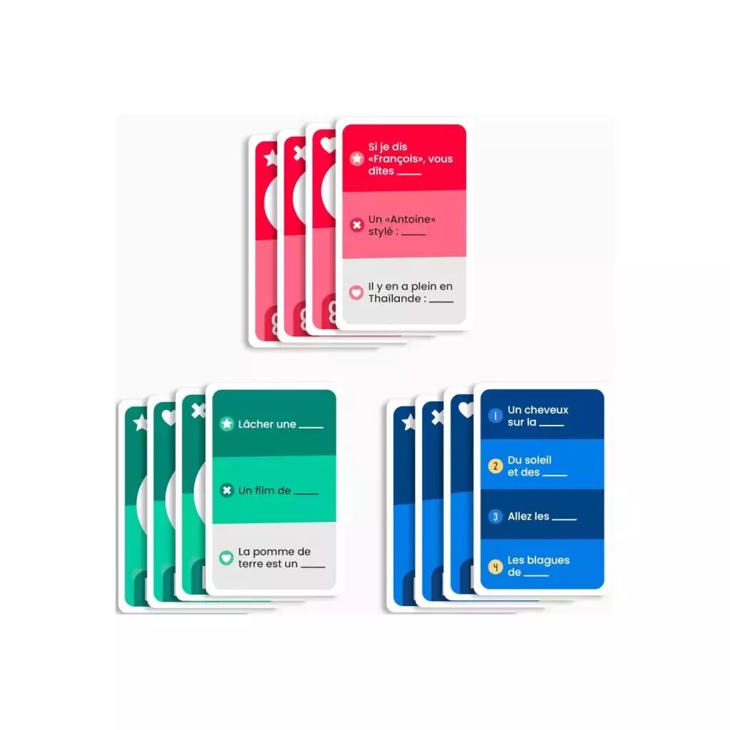 La prise en main est rapide : il suffit d’installer les cartes devant les équipes, et à chaque tour, compléter les phrases en même temps. Pas de temps mort, ni de règles obscures, ce qui favorise une dynamique fluide idéale pour les familles, soirées entre amis ou grands groupes. L’objectif est simple : accumuler le plus de cartes sans faire d’erreur fatale.