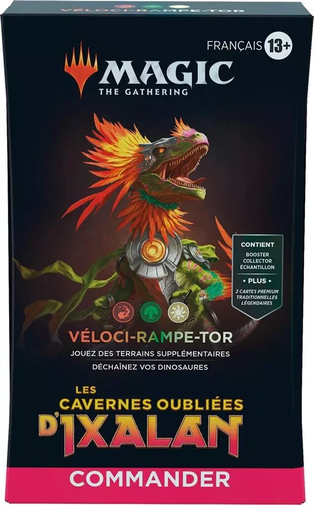 – 1 deck Commander de 100 cartes prêt-à-jouer Les cavernes oubliées d’Ixalan ; 2 cartes Premium traditionnelles + 98 cartes non-Premium