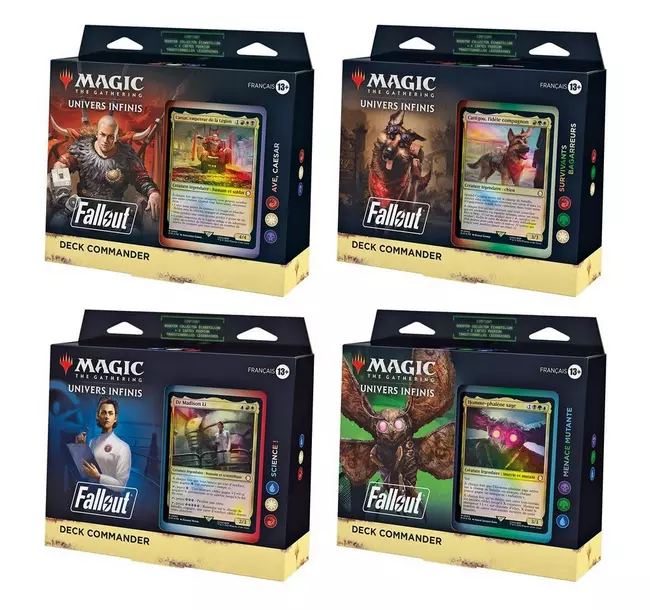 Chaque deck inclut 1 deck prêt-à-jouer de 100 cartes Magic (2 cartes légendaires Premium traditionnelles, 98 cartes non-Premium), 1 booster collector échantillon (contenant 2 cartes à traitement spécial non-Premium ou Premium traditionnelles, dont 1 carte à illustration étendue de rareté rare ou supérieure et 1 carte à illustration alternative et à cadre alternatif de rareté inhabituelle ou supérieure), 1 commandant de présentation super Premium (un exemplaire de la carte de commandant sur du papier cartonné avec une texture Premium sur la bordure et l'illustration), 10 jetons recto-verso, 1 boîte de deck (pouvant contenir 100 cartes avec protège-cartes), 1 roue de points de vie, 1 feuillet de stratégie et 1 fiche de référence.