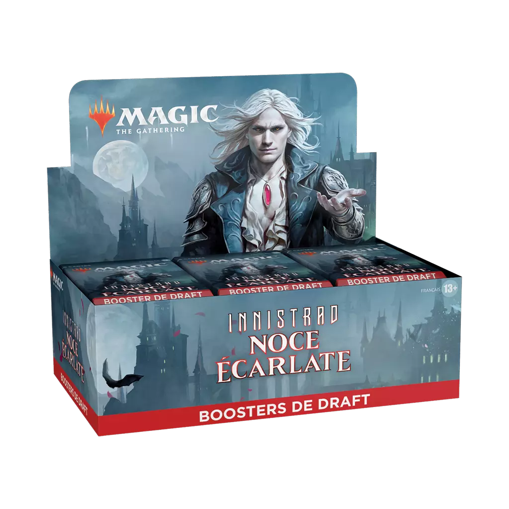 Un booster de draft Innistrad : Noce Écarlate contient toujours 2 cartes recto-verso, dont 1 commune et une unco, rare ou mythique.