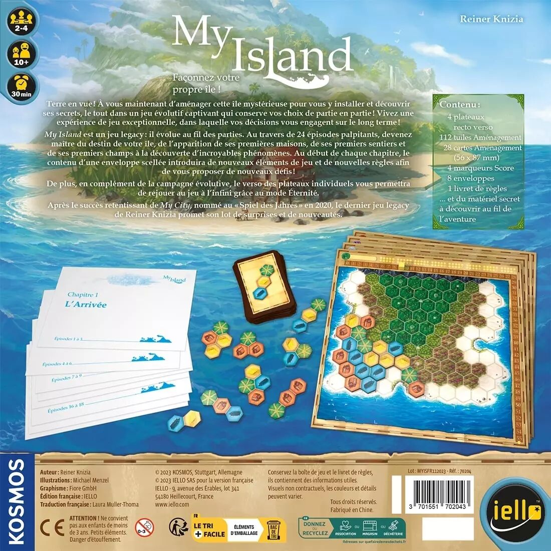 My Island reprend la philosophie de MyCity, mais l’étend considérablement en lui offrant une zone de jeu plus ambitieuse. Dans My Island, chaque joueur dispose en effet d’un plateau de jeu représentant une partie de l’île. À chaque tour, il révèle une carte et place simultanément la tuile représentée sur son plateau, ou bien il la défausse s’il ne parvient pas à trouver un placement valide ou avantageux. Les tuiles comportent deux à quatre hexagones connectés avec des champs, des maisons, des chemins, etc., clairement différenciés par des blocs de couleur. Chaque partie commence en posant des tuiles sur la plage de l’île, et les emplacements de plage non recouverts en fin de partie occasionneront des malus. Les règles de pose changent évidemment au fil de vingt-quatre parties, réparties en huit chapitres de trois épisodes chacun, au fur et à mesure que les joueurs arrivent sur l’île et commencent à la développer. Au fil des chapitres, de nouveaux objectifs, contraintes et moyens de marquer des points apparaissent.