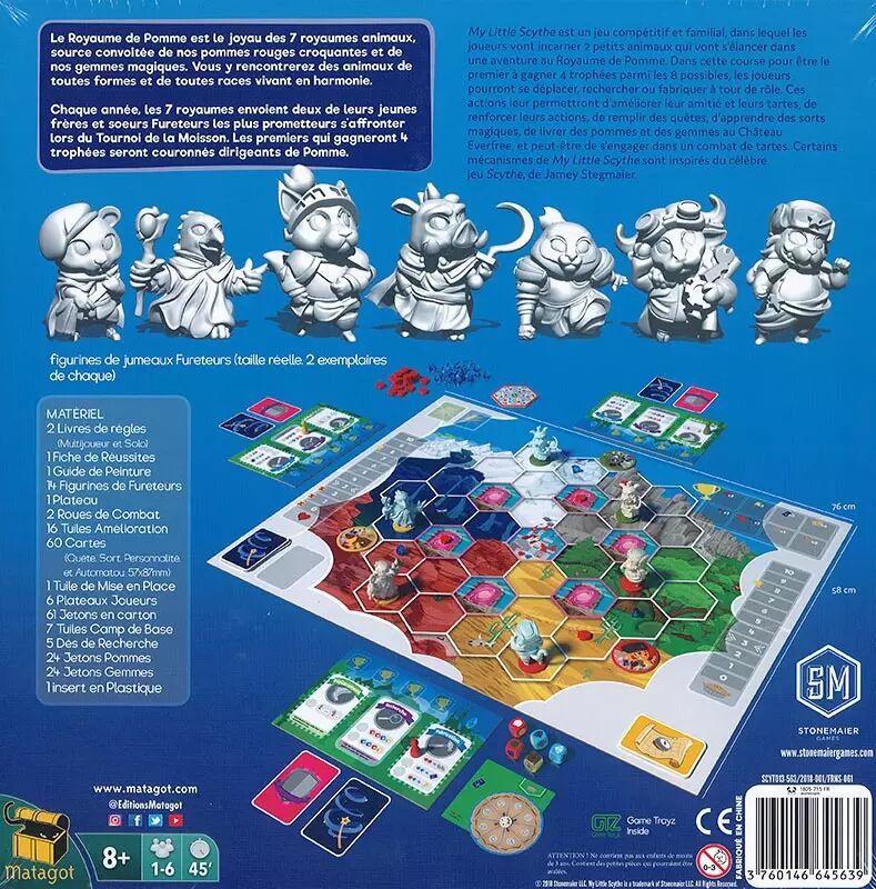 Réf. : MATSCY101563 My Little Scythe est un jeu compétitif et familial, dans lequel les joueurs vont incarner 2 petits animaux qui vont s'élancer dans une aventure au Royaume de Pomme. Les joueurs vont améliorer leur amitié et leurs tartes, renforcer leurs actions, remplir des quêtes, apprendre des sorts magiques, livrer des pommes.