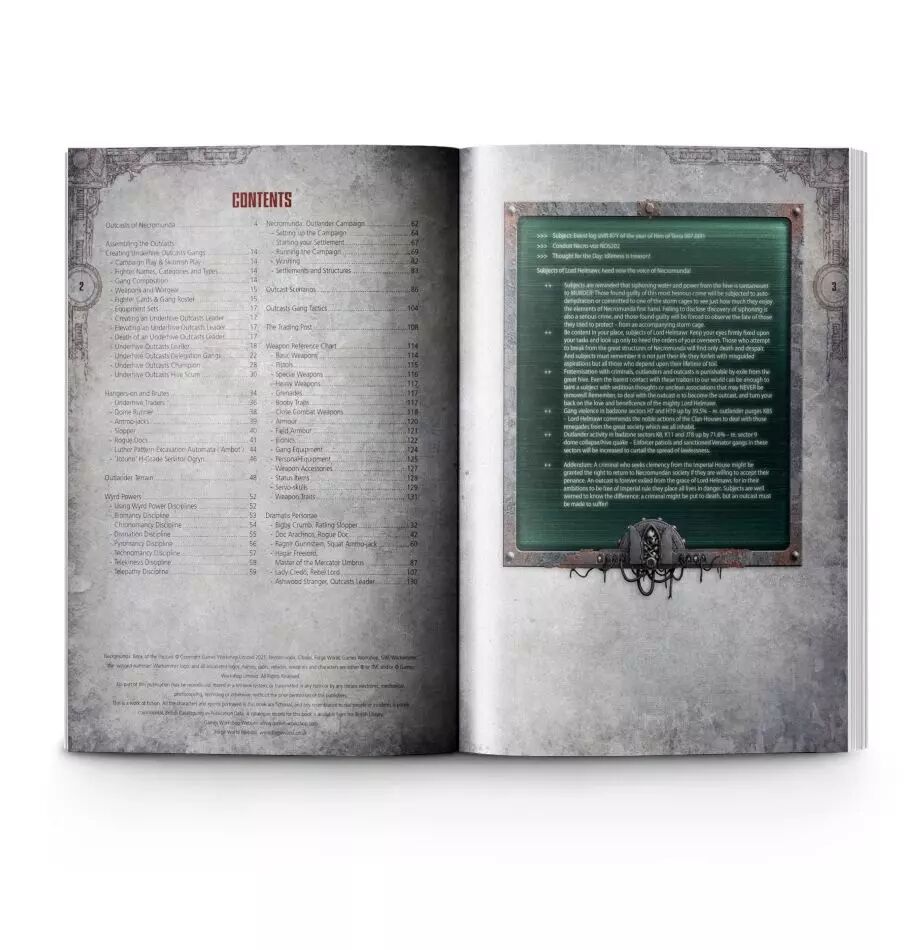 - Outlander Terrain: All the terrain rules needed to establish a stronghold for Necromunda gangs, usable with the included Outlander Campaign or any game of Necromunda, as well as rules for fighting across Underhive Markets, Walls and Gates, Watchtowers, and Gunk Tanks