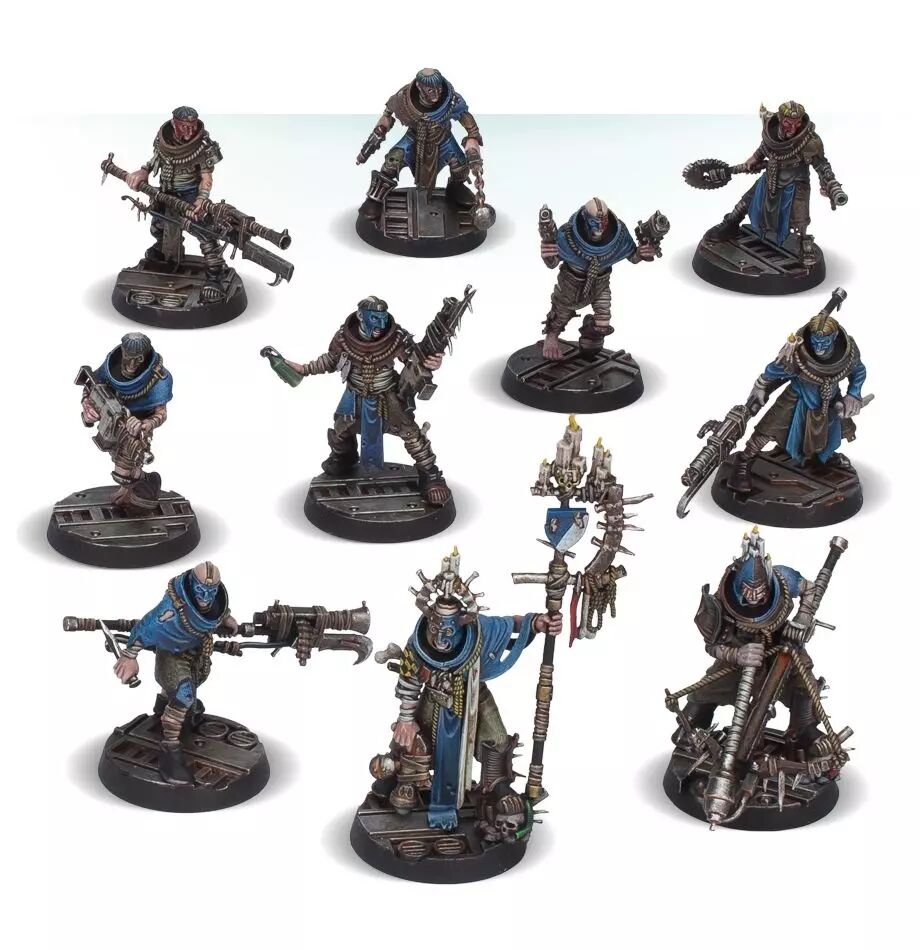 - 10 corps de 5 modèles différents, soit 2 de chaque, équipés de matériel de récupération jugé digne de l'Empereur, et ornés de quantité de chandelles et de liens rituels tels que des nœuds coulants. Ces corps ont été conçus pour s'adapter préférentiellement à certaines options d'armes, mais vous êtes bien entendu libre de les monter à votre guise;