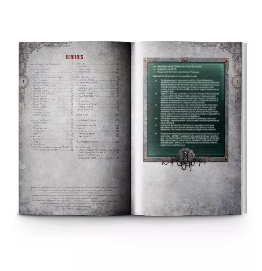 - Additional Rules: This section includes new and additional rules usable by House Delaque gangs in games of Necromunda, providing Delaque players a variety of options, including Skills, Abilities, and gang-specific terrain.