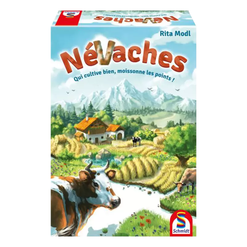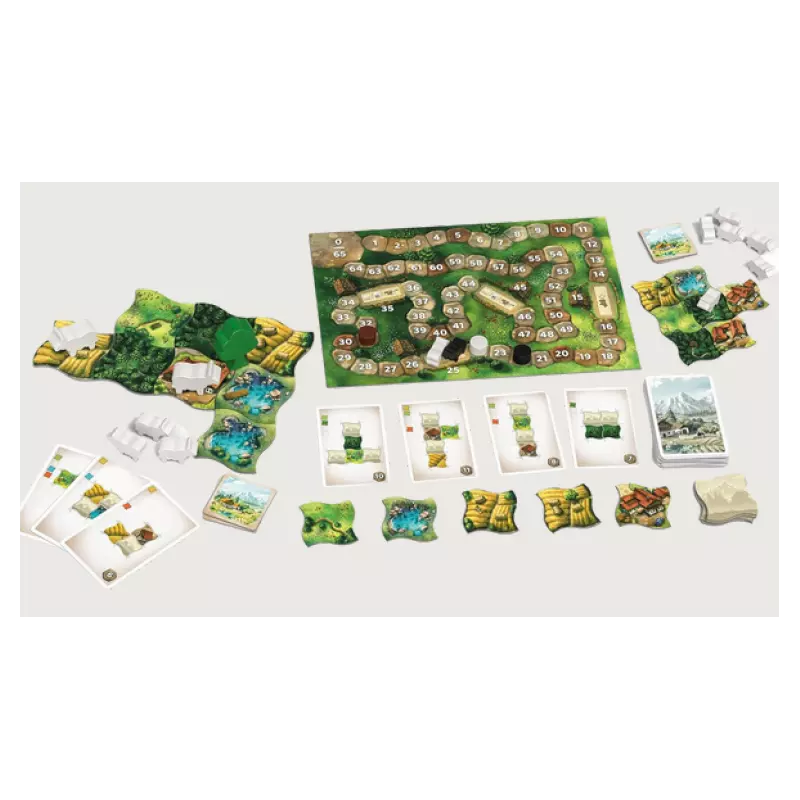 Contenu : 1 piste de score, 1 jeton premier joueur, 4 marqueurs de score, 8 jetons arbre, 9 tuiles de départ, 24 jetons vaches, 55 cartes, 71 tuiles paysage.