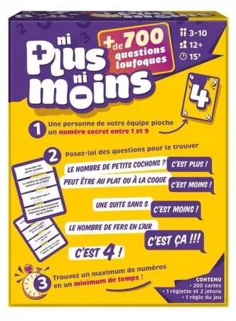 Dans Ni Plus Ni Moins, un joueur de chaque équipe pioche un chiffre secret. Les autres joueurs doivent ensuite poser des questions loufoques et drôles pour trouver ce chiffre, en se basant sur les réponses "C'est plus", "C'est moins" ou "C'est ça".