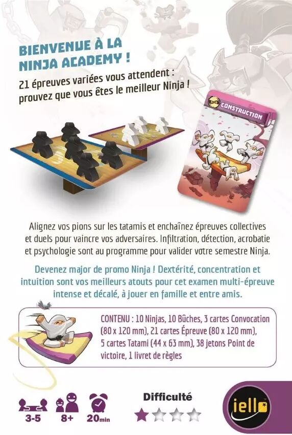Que vous soyez un joueur expérimenté ou un novice, Ninja Academy vous procurera des moments de divertissement inoubliables. Son format compact et ses règles simples en font un jeu idéal pour les soirées entre amis ou en famille. Les illustrations charmantes et les épreuves variées ajoutent une touche d'humour et de stratégie au jeu.