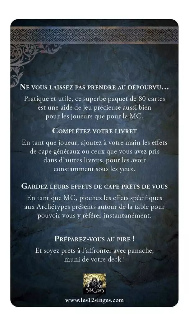 Gardez leurs effets de cape prêts de vous En tant que MC, piochez les effets spécifiques aux Archétypes présents autour de la table pour pouvoir vous y référer instantanément.
