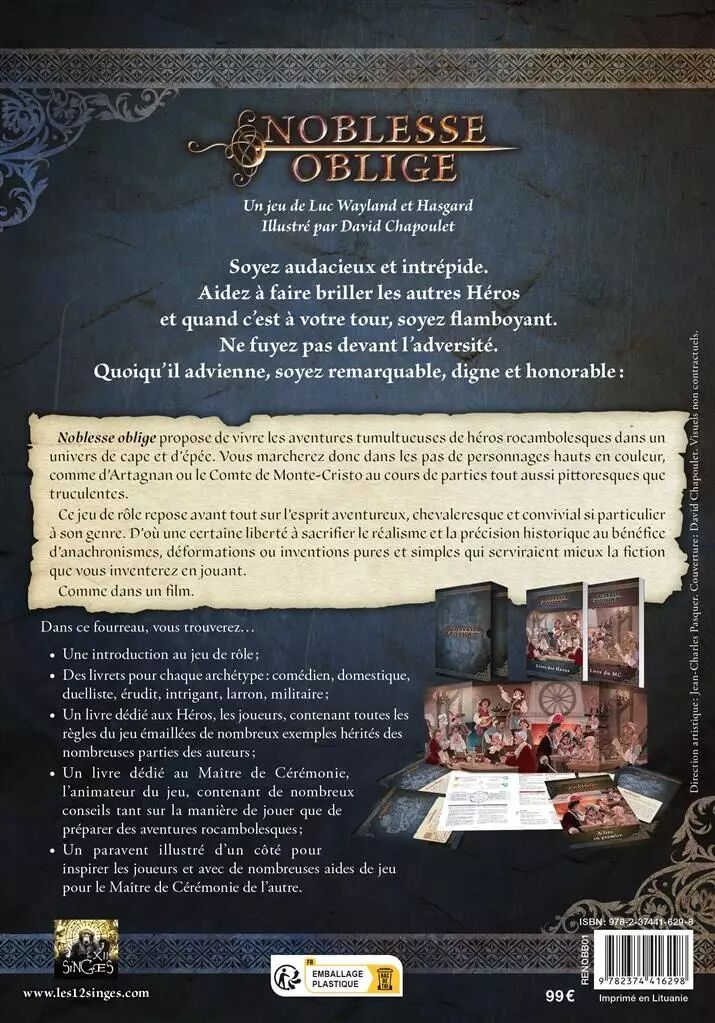 Noblesse oblige est proposé en deux ouvrages complémentaires. En effet, pour profiter pleinement des jeux hérités d'Apocalypse World (ou PbtA), il est préférable de tout lire. En d'autres termes, point de secrets dans Noblesse oblige. Cependant, en cours de partie, le MC et un autre participant apprécieront d'accéder à leurs règles et leurs conseils sans avoir attendre que l'autre repose un ouvrage unique.