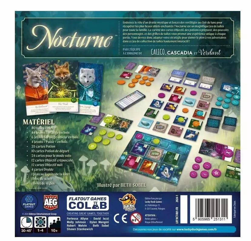 Nocturne transporte dans un univers féérique où chaque joueur collecte plumes de phénix, champignons lumineux et œufs mystérieux, le tout sous le voile de la magie. Les enchères tactiques sur une grille forestière offrent des choix détonants où l’intuition se mêle habilement à la réflexion.