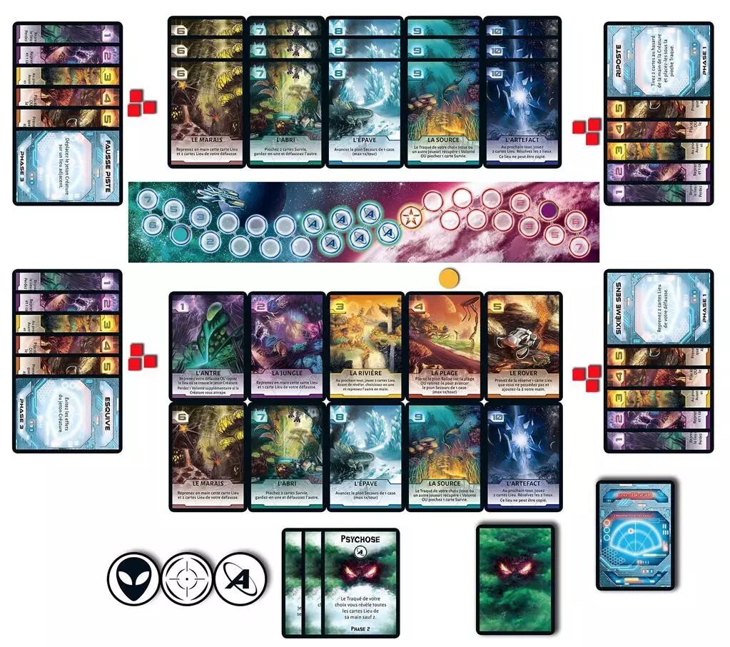 Si vous incarnez l'un des Naufragés, vous explorerez Artemia au moyen de cartes Lieux. Aidés de vos cartes Survie, vous tenterez de résister à la traque de la Créature jusqu'à l'arrivée des secours.