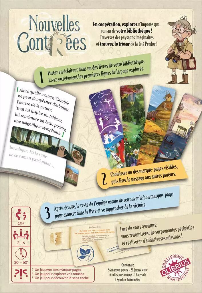 C'est simple. Pour nous, Nouvelles Contrées est un jeu génial et révolutionnaire qui mérite tous les prix ludiques du monde?! Jeu coopératif, les joueurs y explorent n'importe quel roman de leur bibliothèque?! Au début de la partie, les joueurs montent leur Camp, représenté par un marque-page, quelque part au début du livre. Ils doivent le faire avancer jusqu'au marque-page Cité Perdue, placé plus loin. À chaque tour de jeu, un des joueurs, l'Éclaireur (le lecteur) lit un court passage dans le livre et l'associe secrètement à un des quatre marque-pages Exploration (parmi 32 superbement illustrés) exposés au centre de la table. Les autres joueurs essayent de désigner le même marque-page que l'explorateur, mais aussi tentent de réussir l'une des missions disponibles, parmi les 28 (Dans l'extrait lu, y a-t-il au moins 4 mots de 1 à 3 lettres?? Y a-t-il au moins 3 majuscules?? Les mots Il et Ils sont-ils absents?? etc.). Au fil des réussites, le marque-page du camp avance, jusqu'à rejoindre le marque-page Cité Perdue (il y en a 5 différents) et découvrir le sens caché du livre?! La boîte propose également 5 variantes/Modules, et même des pions pour un prochain à sortir?! Communication, lecture, imagination, essayer Nouvelles Contrées, c'est l'adopter?!