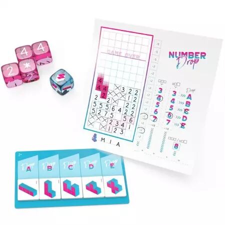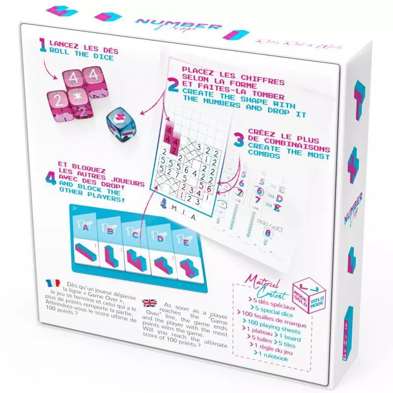 A chaque tour, les joueurs doivent combiner les 5 dés pour créer une forme contenant les 4 chiffres. Il vont ensuite faire « tomber » cette forme dans leur grille, et essayer de la placer de manière à ce que les chiffres de toutes les formes soient organisés en suites de chiffres ou en séries de chiffres identiques. Valider des séries ou des suites permettra aux joueurs de marquer des points, mais aussi d'envoyer des Drop dans les grilles des adversaires pour contrer leurs plans. Qui sera le plus malin??Contenu :