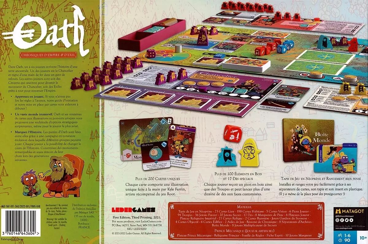 Oath : Chronicles of Empire and Exile est un jeu de plateau de stratégie pour un à six joueurs, dans lequel les joueurs vont influencer le cours de l'histoire dans un monde séculaire.