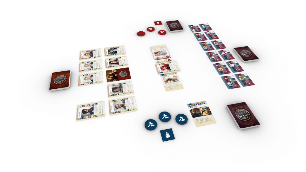 Vient ensuite la phase de Procès, au cours de laquelle les joueurs appellent des témoins à la barre, élaborent des arguments puissants, les confrontent aux preuves patiemment examinées. Pour former un interrogatoire cohérent, les joueurs devront enchaîner leurs cartes en faisant correspondre des symboles de Préjugés.