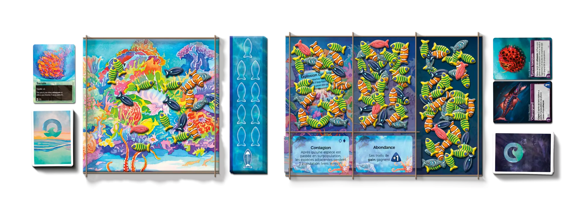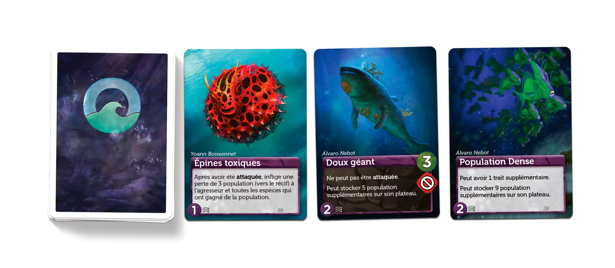 Vos espèces pourront gagner en population de différentes manières. Choisissez d'être pacifiste en préférant fouir le récif ou au contraire d'être agressif en attaquant d'autres espèces et leur volant des jetons de Population ! Vous pouvez également développer des attributs qui vous permettront de gagner de la population directement dans l'Océan, par l'action d'autres joueurs. A vous de trouver votre place dans le règne animal !