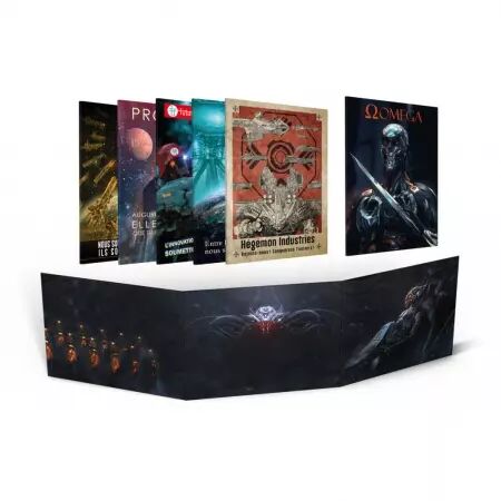 Oméga est un superbe livre de 320 pages format US letter, couverture rigide carré, cousu. Cet ouvrage comprend la description de l’univers, les Firmes, la création de personnages, les règles de jeu et un scénario introductif.
