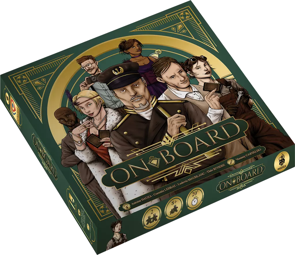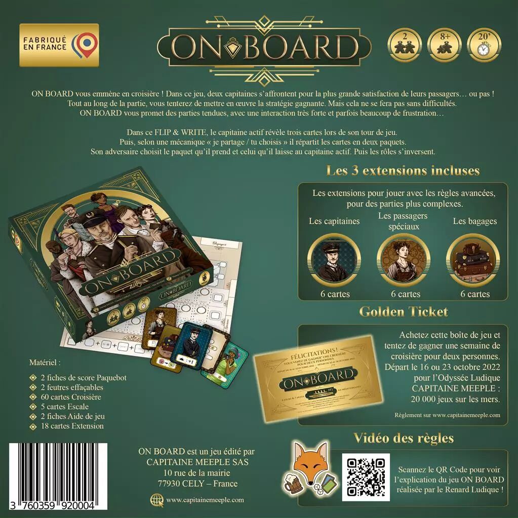C'est ce que firent 300 passagers, en 2019, en embarquant pour une croisière jeux ! Et que trouvèrent-ils en cadeau de bienvenue, dans leur cabine, un jeu de société pour deux, nommé Bienvenue à bord. Conçu par la team Kaedema, composée de talentueux créateurs de jeux (Antoine Bauza, Corentin Lebrat, Ludovic Maublanc et Théo Rivière), ce jeu a tellement plu que l'éditeur, Capitaine Meeple a décidé d'en faire une version destinée aux magasins de jeux, On board?! Chaque joueur est le capitaine d'un bateau et tente de satisfaire au mieux ses voyageurs. À tour de rôle, on retourne 3 cartes, placées en un tas de deux et une carte seule. L'adversaire choisit lequel des deux paquets il prend, puis c'est lui qui pioche et ainsi de suite. Les cartes cabine vous permettent d'ouvrir des cabines en 1re, seconde ou troisième classe, et d'améliorer les cabines avec de belles vues, un bar, etc. Les cartes Passagers amènent des voyageurs à installer dans les cabines, mais respectez leurs désirs où vous aurez des clients mécontents?! Au fil de la partie, vous cochez les cases sur votre feuille de bord, tout en essayant de remplir vos objectifs. Toutes les 5 cartes, une étape permet de faire un décompte choisi. À la fin de la partie, le joueur possédant le plus de points l'emporte.