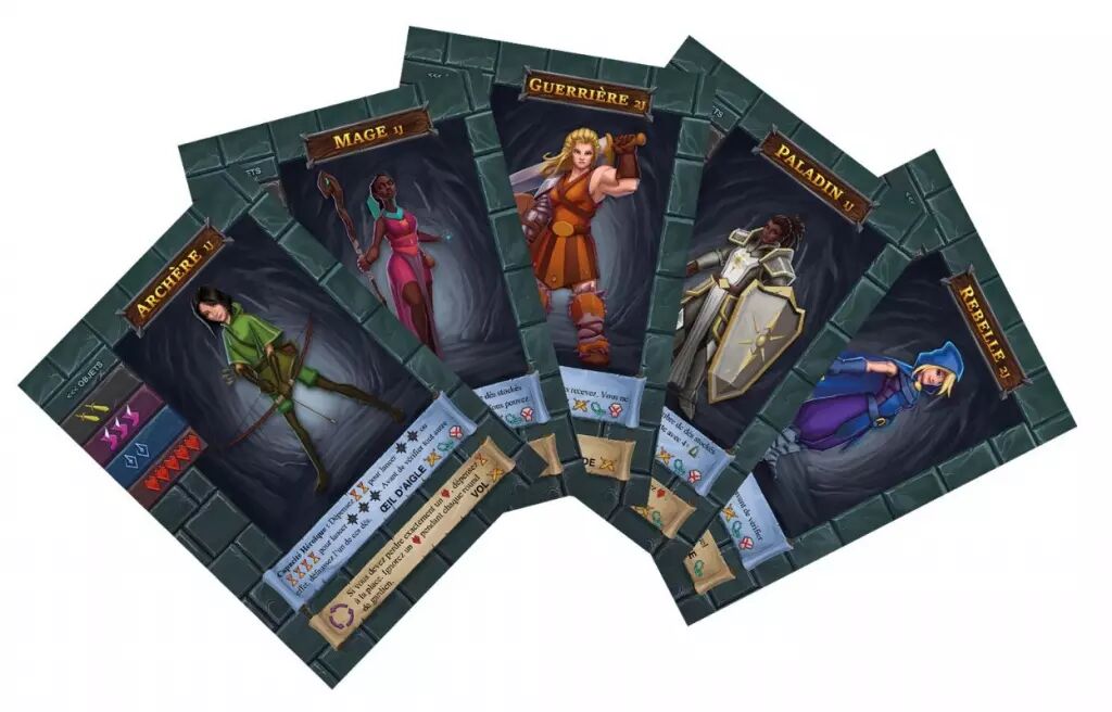 One Deck Dungeon est livré avec 44 cartes rencontres, 5 cartes souterrains/monstres, 4 cartes niveaux, 2 cartes aptitudes de base et l'importante carte d'escaliers, sans laquelle vous seriez bloqué sur le premier niveau pour toujours.Sontégalement inclues six cartes grand format : une pour chacune des cinq héroïnes ainsi qu'une sixième qui sert de référence de tour. Pour les combats, il y a 30 dés de quatre couleurs différentes. Enfin... lorsque vous vous trouverez en mauvaise posture lors d'un combat : les marqueurs de santé qui servent à indiquer les dégâts subis par votre héroïne, ainsi que des cubes de potions que vous pourrez utiliser pour vous soigner ou pour bien d'autres choses incroyables.