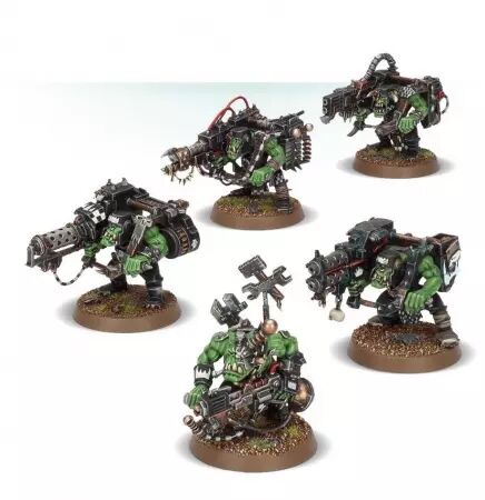 Ces figurines d'Orks musculeux portent, en guise d'armes, toutes sortes de bricolages dangereux à l'aide de sangles grossières et de harnais pesants. Certains sujets portent des masques ou des lunettes d'étrange facture, et les mékanos ont des outils en guise de signe distinctif. On entrevoit le sourire cruel des pillards au milieu de l'encombrant harnais de kanon eud'la mort, qui est pour eux une source d'intense satisfaction.