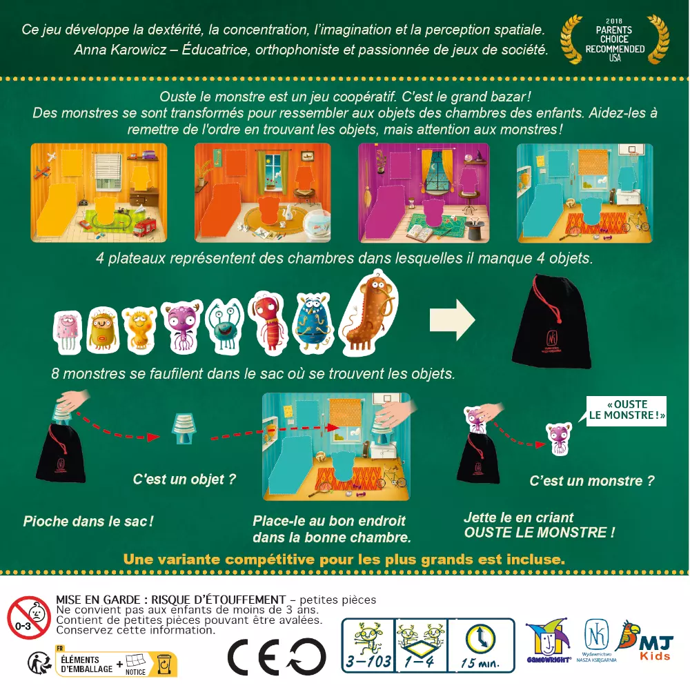 Ouste les monstres est un jeu coopératif. C’est le grand bazar ! Des monstres se sont métamorphosés pour ressembler aux objets des chambres des enfants. Aidez-les à remettre de l’ordre en trouvant les objets, mais attention aux monstres !