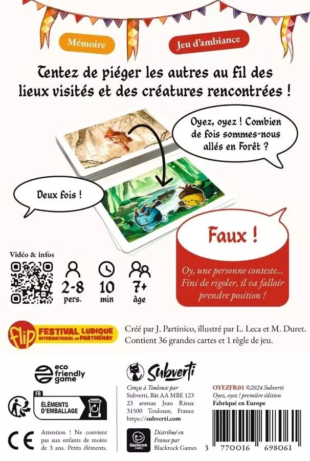 Vous cherchez un jeu pour animer vos événements ? Oyez, Oyez ! est le choix parfait ! Son format court et dynamique, ainsi que son ambiance festive, en font un jeu idéal pour des animations réussies. Petits et grands seront captivés par ce défi de mémoire original et amusant.