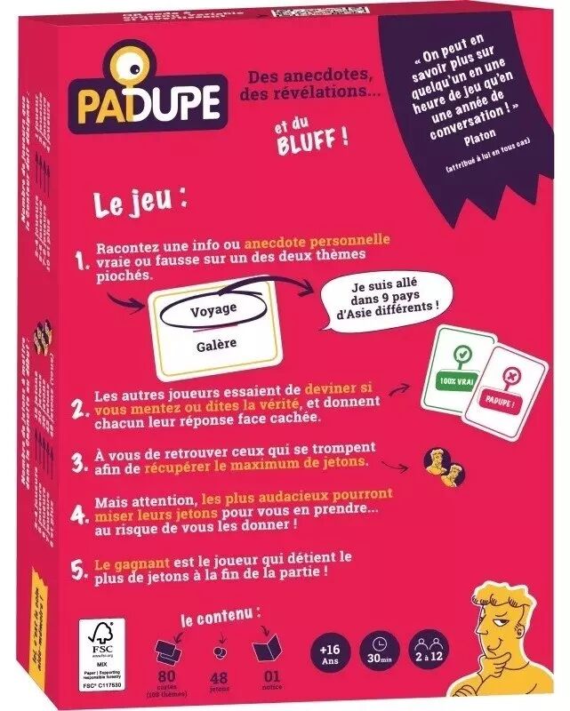 Un jeu d'anecdotes qui résout la principale barrière des jeux d’anecdotes, à savoir le manque d’imagination ou le manque d’envie de raconter des choses sur soi. En effet le Padupe fonctionne même avec les plus timides !