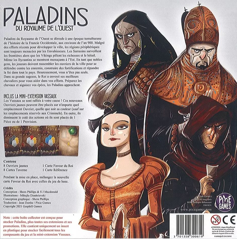 Cette boîte de rangement Collector permet de réunir Paladins et son Extension dans un seul et même contenant de belle facture. Elle offre en outre la mini extension : "Vassaux" (ces nouveaux Ouvriers faisant office de jokers, en plus d'affecter favorablement le coût en Argent ou en Provisions de certaines actions).
