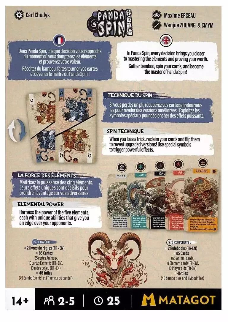 Impossible d’ouvrir la boîte sans tomber sous le charme de ses cartes aux couleurs sobres et motifs dorés ! Inspirées du zodiaque chinois, elles offrent un vrai plaisir visuel tout autant qu’au toucher, et les deux artistes derrière ce design n’ont pas fait les choses à moitié. Le matériel inclus (85 cartes, tuiles bambou, jeton Panda et aides de jeu) promet une prise en main instantanée et agréable.