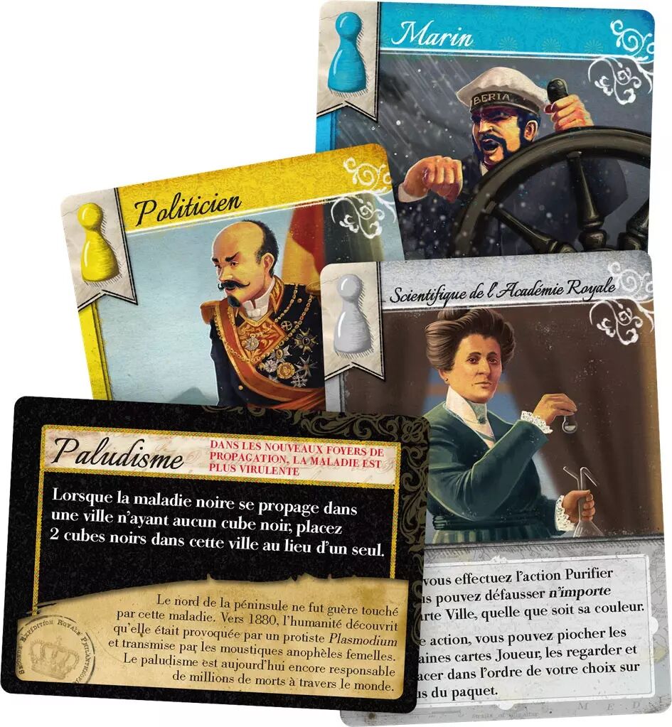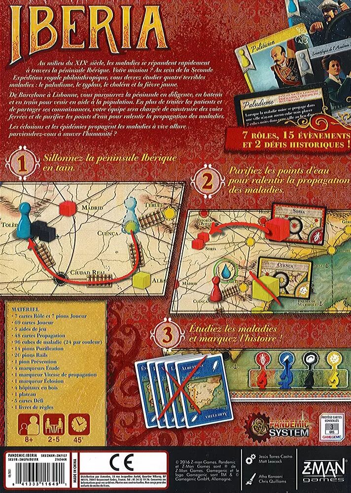 Bienvenue dans la Péninsule ibérique ! Pandemic Iberia vous ramène au milieu du XIXe siècle et vous permet d’endosser le rôle d’une infirmière, d’un cheminot, d’un marin et plus encore pour combattre la malaria, le choléra, le typhus et la fièvre jaune. De Barcelone jusqu’à Lisbonne, voyagez par charriot, par bateau ou par train, et aidez le peuple ibérique à développer les chemins de fer et à distribuer de l’eau potable pour sauver la péninsule dans cette nouvelle version de Pandemic.