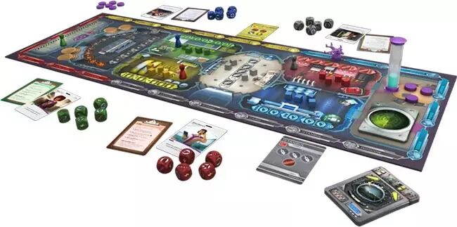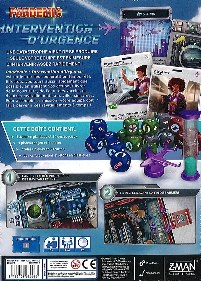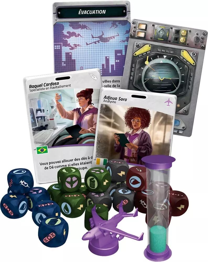 Le temps vous est compté ! Si le tour n’est pas fini lorsque le dernier grain de sable est descendu, tout est interrompu, un jeton temps est défaussé. Le sablier est retourné, et le tour reprend ensuite normalement. Si la situation se reproduit avant que toutes les villes ne soient secourues, et qu’il n’y a plus de pion temps à défausser, la partie est perdue ! Autre danger, toute production de caisses risque de générer des rebuts qui s’accumulent dans l’avion. Des dés sont lancés et le marqueur rebut avance sur sa piste. S’il atteint la dernière, la partie est perdue. L’activation du centre de recyclage permet de baisser le niveau.